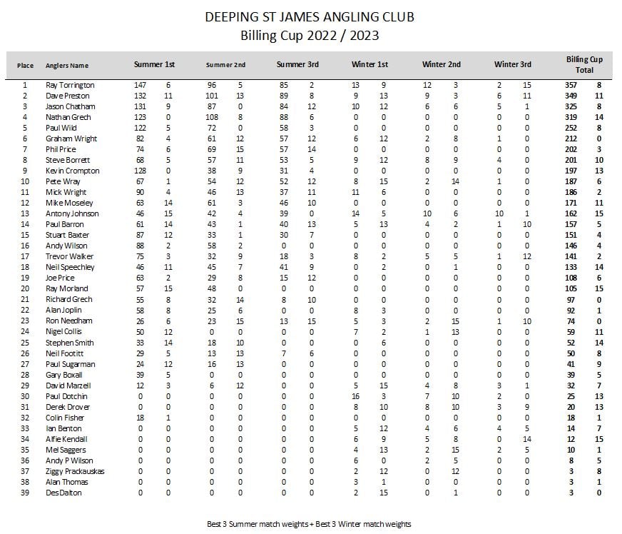 Last year’s winner was Ray Torrington with 427 lb 8 oz – (102lb over 2nd place). This year things were a little tighter with just 37 lb separating the top 4 anglers. Second place was 349 lb 11 oz, but with a combined weight of 357 lb 8oz (just under 8lb more) the Billing Cup winner is once again Ray Torrington.