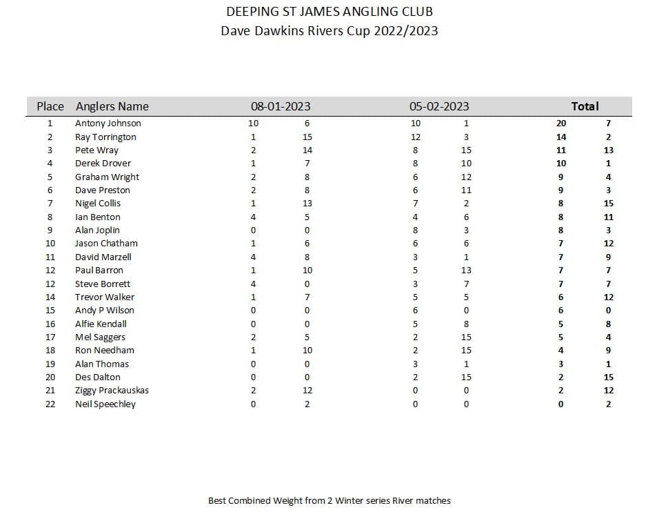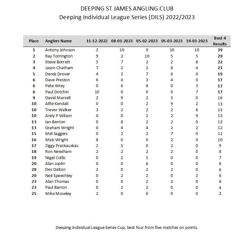 Fished on both the River Nene and the Fish Refuge December 2022 to March 2023. There were only two anglers competing in the final round, Ray Torrington and Antony Johnson. Drawing the bowl certainly helped him, but he finishing in first place on the day and rounded DILS off with 39 points from a possible 40 (three wins and one second place) this years DILS winner is Antony Johnson