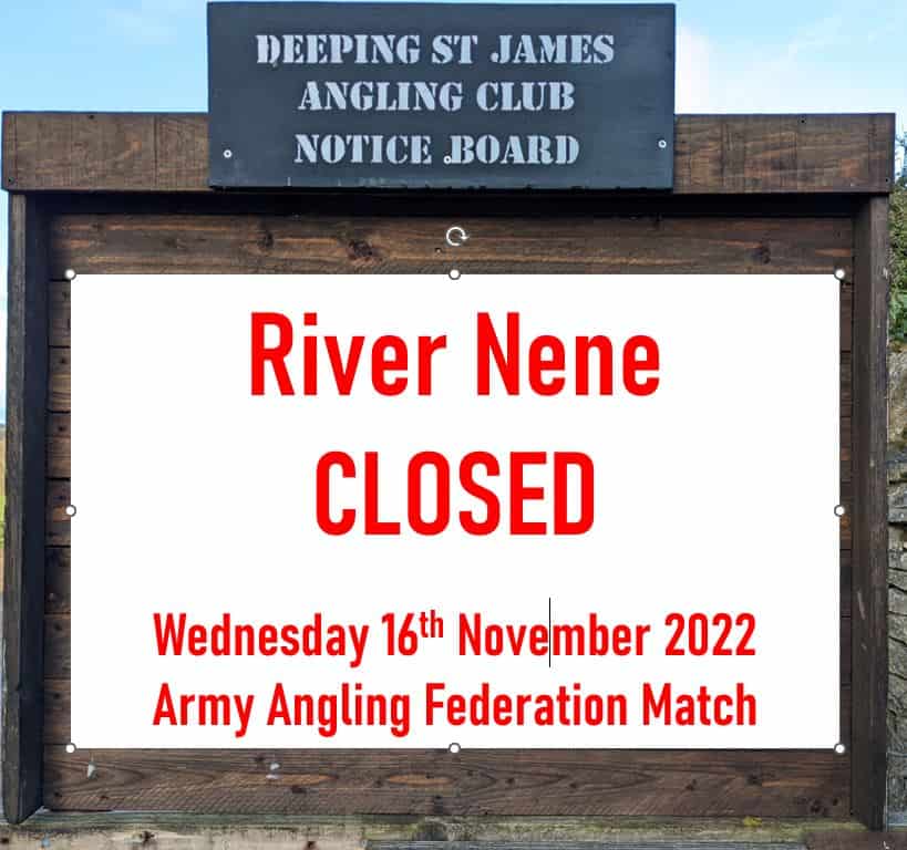 Note to all members – The River Nene at Sibson (Horseshoe Lake Entrance) will be closed on Wednesday 16th November for an Army Angling Federation Match all day.